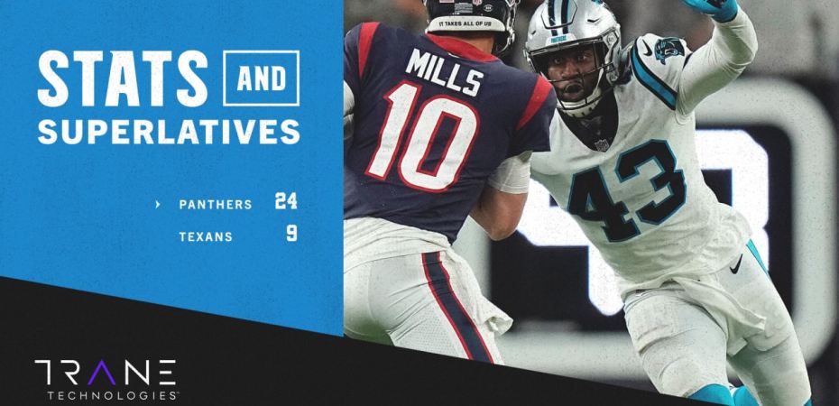- A Panthers védelme 193 yardon tartotta a Texanst, ez zsinórban a harmadik olyan mérkőzés, amikor 200 yard alatt tartották az ellenfelet. A Carolina az első három meccsén mindössze 573 yardot engedett, ami 1992 óta a legkevesebb egy 3-0-val kezdő csapattól.