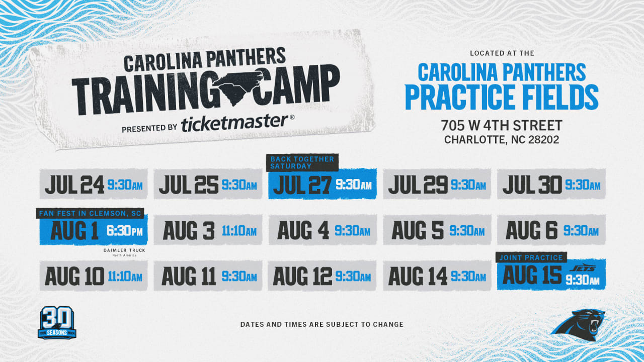 A Panthers július 24-én, szerdán kezdődő edzőtáborának a Carolina Panthers gyakorlópályája ad otthont Charlotte-ban. A Panthers ma azt is bejelentette, hogy a Fan Fest a Clemsonban lesz, ahol a Panthers 1995-ben, a csapat első szezonjában a hazai mérkőzéseket játszotta.